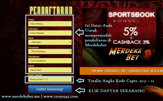 - Daftar Sbobet Casino di Merdekabet juga dapat dilakukan melalui HP Andorid atau Smartphone. Caranya, Anda cukup mengirimkan format pendaftaran sbobet casino yang kami berikan dibawah ini,
